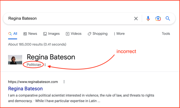 ![Google wrongly claiming Regina Bateson is a political scientist. Google search: [Regina Bateson], the knowledge panel data labeling her as a "Politician", and the top result: Her website, with the following snippetI am a comparative political scientist interested in violence, the rule of law, and threats to rights and democracy. · While I have particular expertise in Latin ... [Red markings indicate the politician label is incorrect.]](/images/ReginaBateson_political_scientist.png)