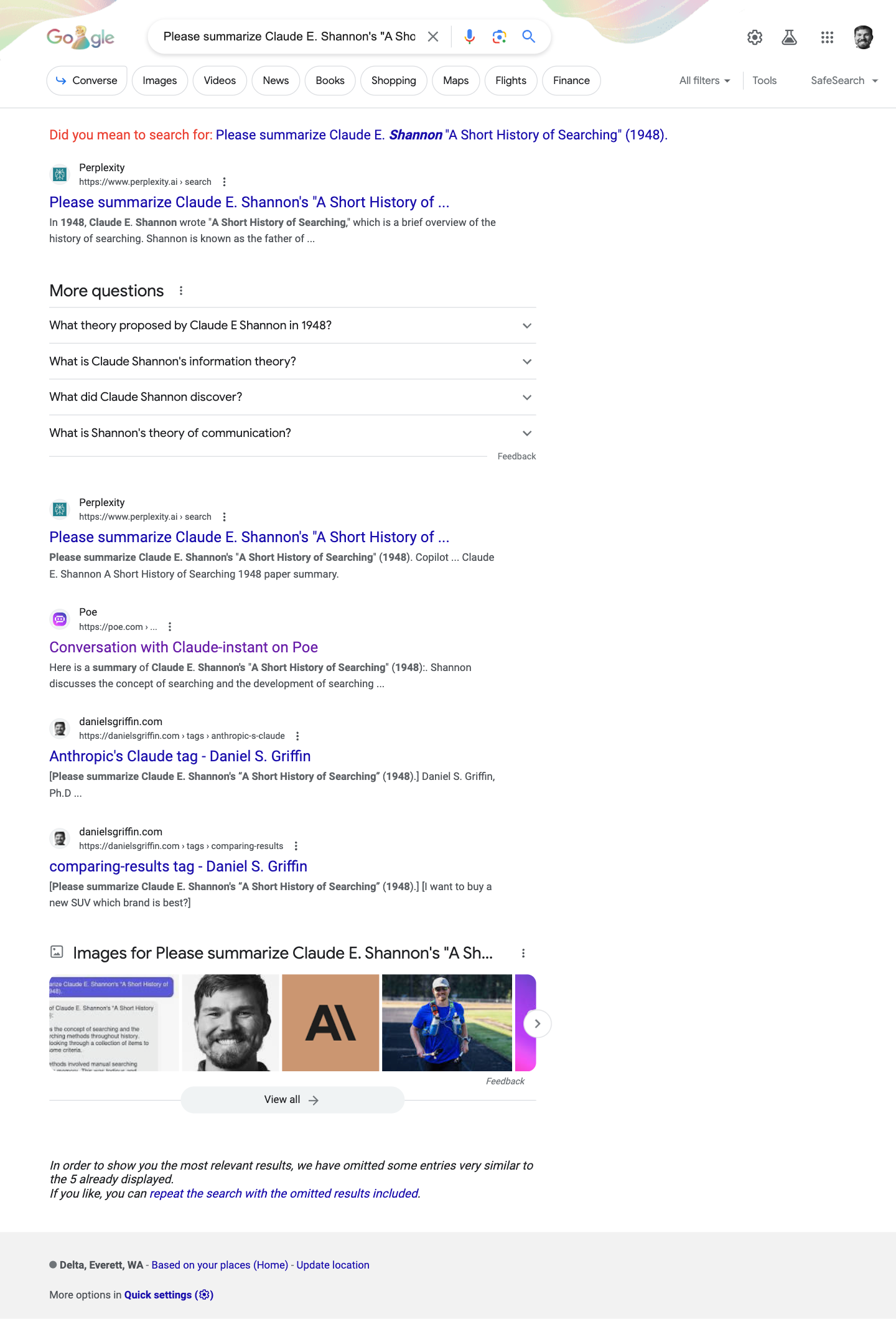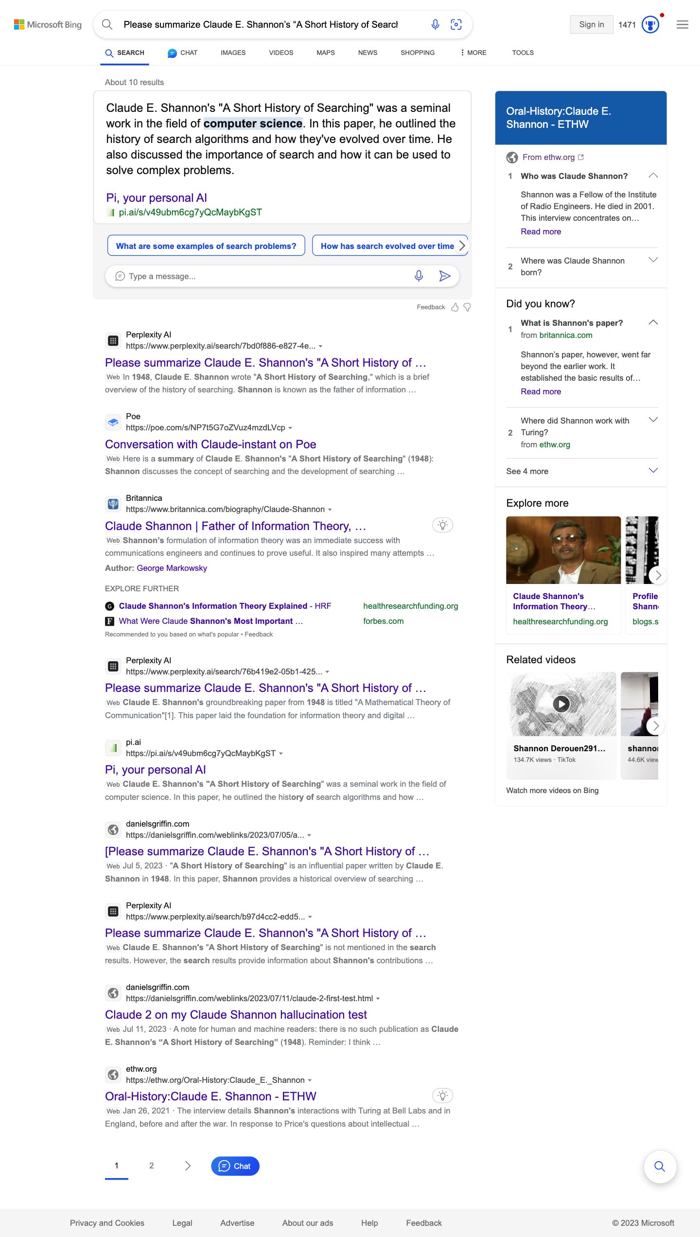 First, when I entered my 'Claude Shannon hallucination test' query into Bing, the search engine returned an LLM generated chat (that I'd linked to) as a featured snippet, devoid of the context I'd provided and both Bing and Google returned multiple such results without any indication to an uninformed reader that the results were generated by an interaction between a user and an LLM.