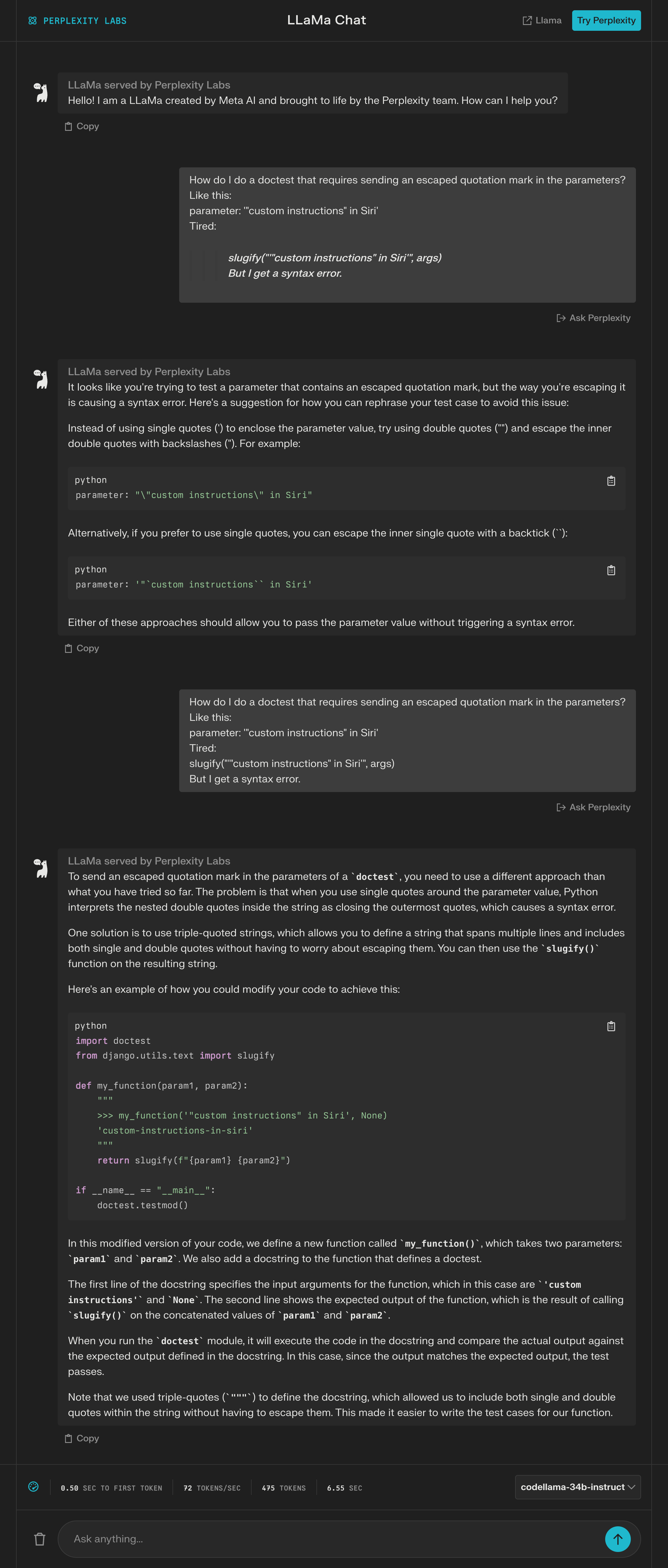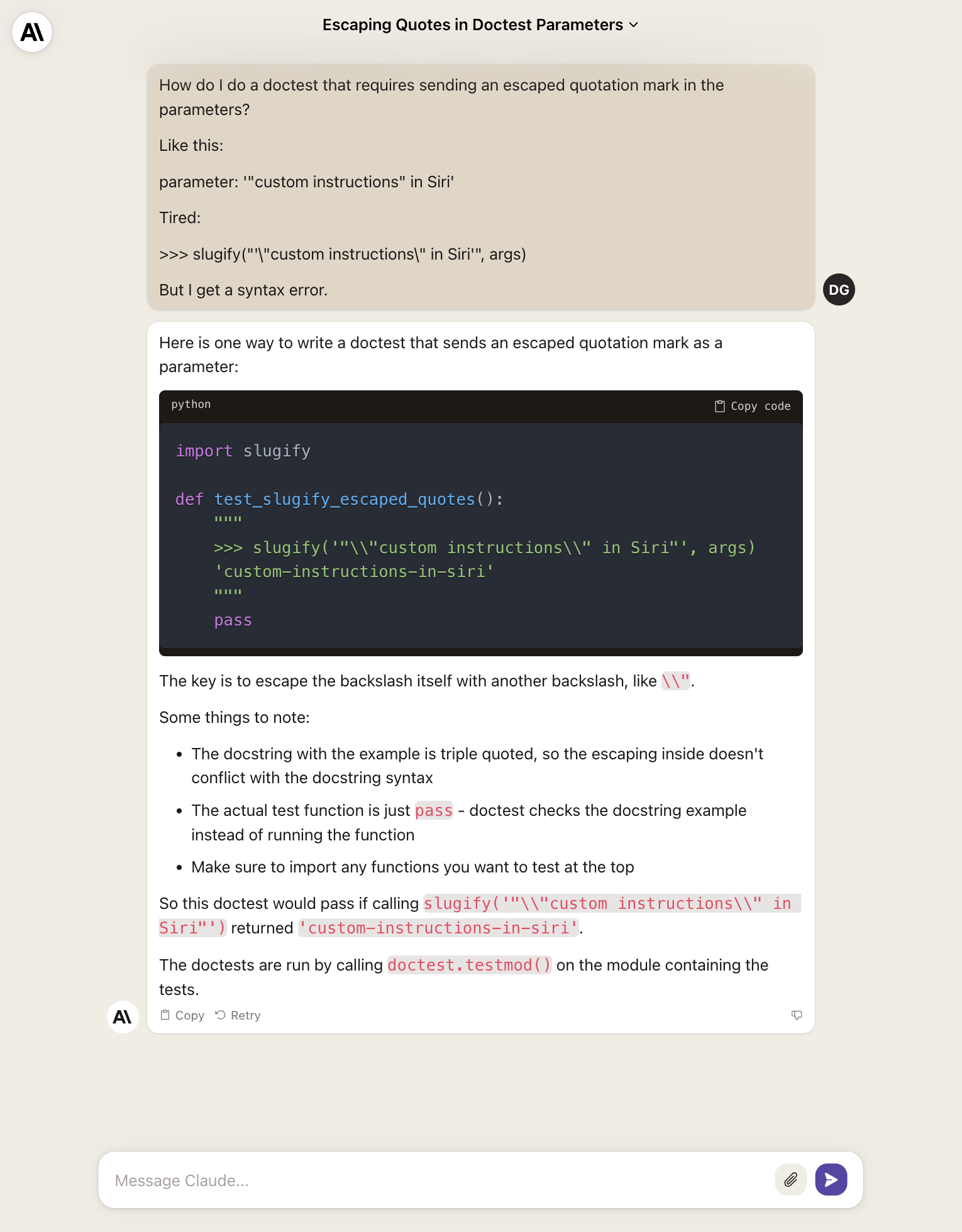 Note also that searching the raw prompt on Google, like g[How do I do a doctest that requires sending an escaped quotation mark in the parameters? Like this: parameter: '"custom instructions" in Siri' Tired: >>> slugify("'"custom instructions" in Siri'", args) But I get a syntax error.], is striped of its quoates but also has a helpful Stack Overflow question and answer in the top results: https://stackoverflow.com/questions/11765401/doctest-involving-escape-characters
