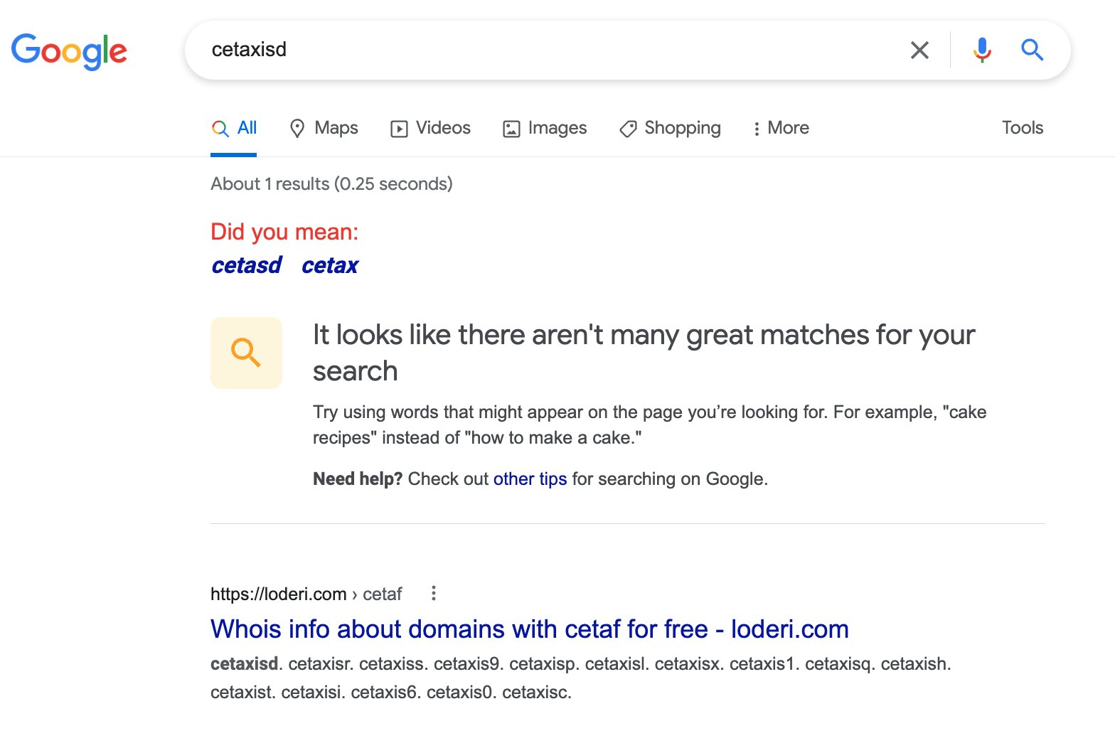 Currently: Google [cetaxisd] "It looks like there aren't many great matches for your search Try using words that might appear on the page you’re looking for. For example, "cake recipes" instead of "how to make a cake." Need help? Check out other tips for searching on Google."