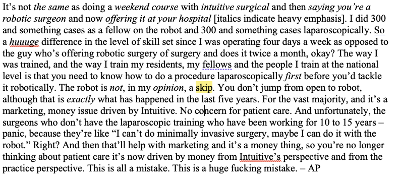 ![The word 'skip' is highlighted in the sentence: The robot is not, in my opinion, a skip. The full paragraph of text: It's not the same as doing a weekend course with intuitive surgical and then saying you're a robotic surgeon and now offering it at your hospital [italics indicate heavy emphasis]. I did 300 and something cases a as a fellow on the robot and 300 and something cases laparoscopically. So a huuuge difference in the level of skill set since I was operating four days a week as opposed to the guy who's offering robotic surgery of surgery and does it twice a month, okay? The way I was trained, and the way I train my residents, my fellows and the people I train at the national level is that you need to know how to do a procedure laparoscopically first before you'd tackle it robotically. The robot is not, in my opinion, a skip. You don't jump from open to robot, although that is exactly what has happened in the last five years. For the vast majority, and it's a marketing, money issue driven by Intuitive. No concern for patient care. And unfortunately, the surgeons who don't have the laparoscopic training who have been working for 10 to 15 years - panic, because they're like "I can't do minimally invasive surgery, maybe I can do it with the robot." Right? And then that'll help with marketing and it's a money thing, so you're no longer thinking about patient care it's now driven by money from Intuitive's. perspective and from the practice perspective. This is all a mistake. This is a huge fucking mistake. - AP](/images/F40voNGa4AAGiQI.png)
