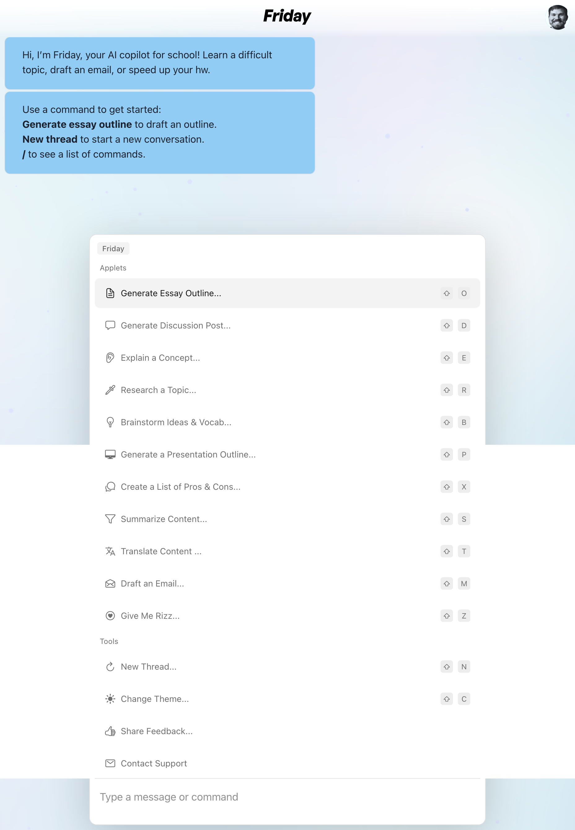 Hi, I’m Friday, your AI copilot for school! Learn a difficult topic, draft an email, or speed up your hw. Use a command to get started: Generate essay outline to draft an outline. New thread to start a new conversation. / to see a list of commands.